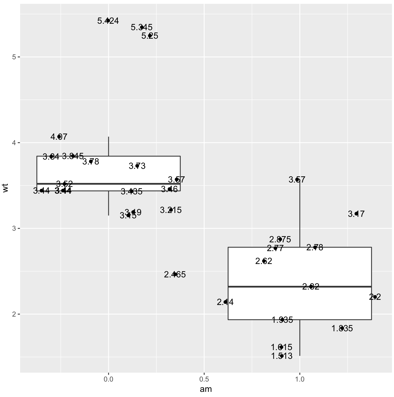 ggplot(mtcars, aes(am, wt, group = am, label = wt)) +