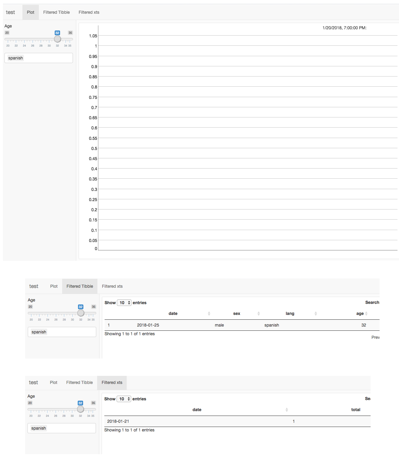 如果我将年龄滑块移动到32的下限和上限,并在输入框中输入“西班牙语”,则图是空的。但是,过滤后的tibble和已过滤的xts对象都显示了1个观察结果。这个观察结果应该出现在情节中,但没有出现。