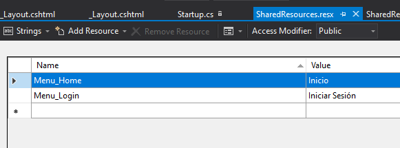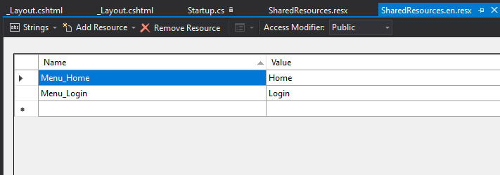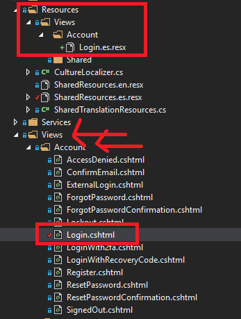 因此,如果您想本地化在Login.cshtml中找到的Views/Account/Login.chsmtl视图,您必须在:Resources/Views/Account/Login.en.resx中创建资源文件。