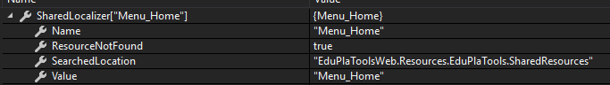 我试着设置断点来查看它的行为。当然,它没有找到资源文件。然后,通过回顾一个不存在的密钥,将其与摩门教徒回购进行比较。我将它与我的输出进行了比较,但摩门教的回购没有显示"SearchedLocation“(它是在后来的.NET核心版本中引入的吗?)