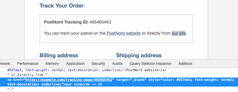 echo '<p>You can track your parcel on the <a href="https://www.postnord.se/en/online-tools/tools/track/track-and-trace" target="_blank" rel="">PostNord website</a> or directly from <a href="#" target="_blank" rel="">our site</a>.<br><br>';
