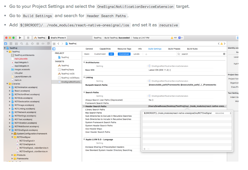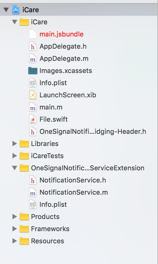 File->New->FileMyProject和OneSignalNotificationServiceExtension,然后完成#import "RCTOneSignalExtensionService.h"中添加OneSignalNotificationServiceExtension-Bridging-Header.h$(SRCROOT)/OneSignalNotificationServiceExtension/OneSignalNotificationServiceExtension-Bridging-Header.h at build setting OneSignalNotificationServiceExtension target但是我发现了一个错误Bridging header 'MyProjectPath/ios/OneSignalNotificationServiceExtension/OneSignalNotificationServiceExtension-Bridging-Header.h' does not exist