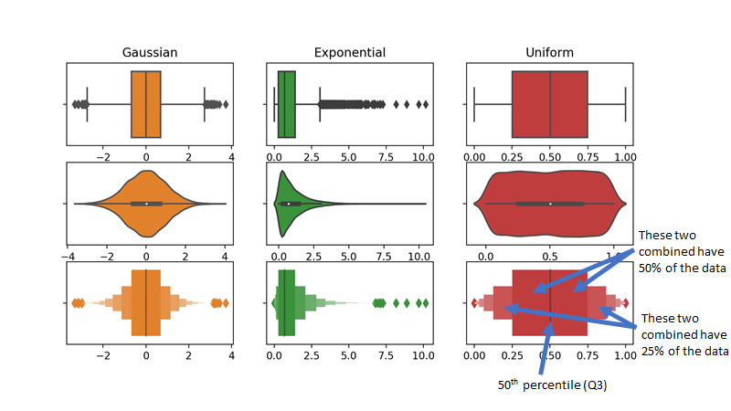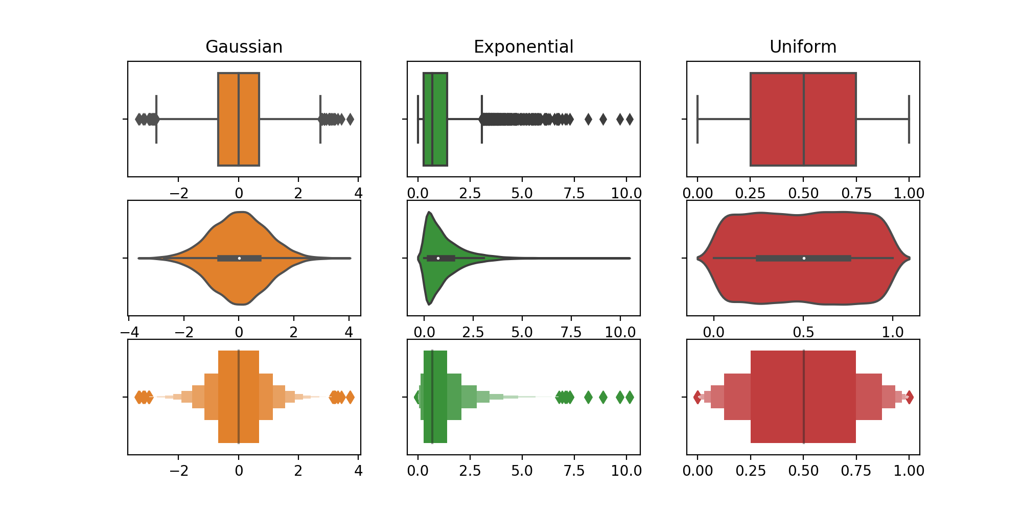 根据我对本文描述了这一概念。的理解(或作者所称的“字母值图”),目标是提供比boxplot更好的数据分布表示。当存在大量异常值时),但不需要选择特定的参数,例如violinplot使用的KDE函数,如果选择不当,可能会扭曲分布的外观。
