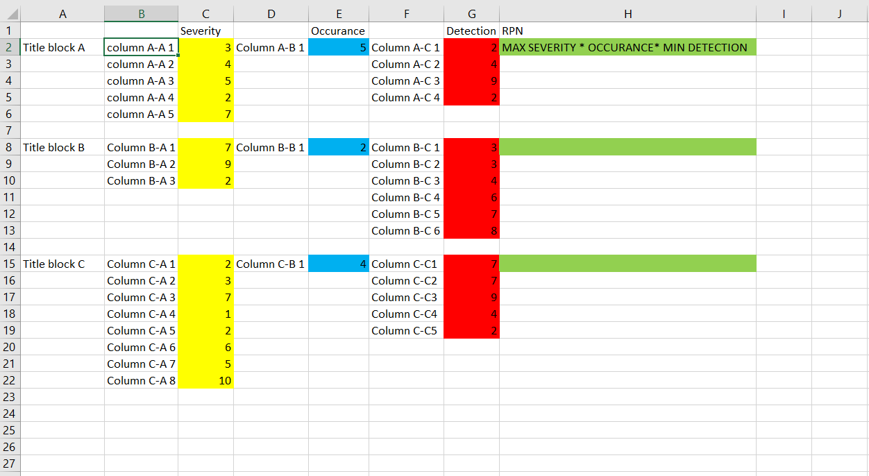 我想取每组黄色单元格的最大值*蓝色单元格的值*红细胞的最小值,并在绿色单元格中显示这个值。