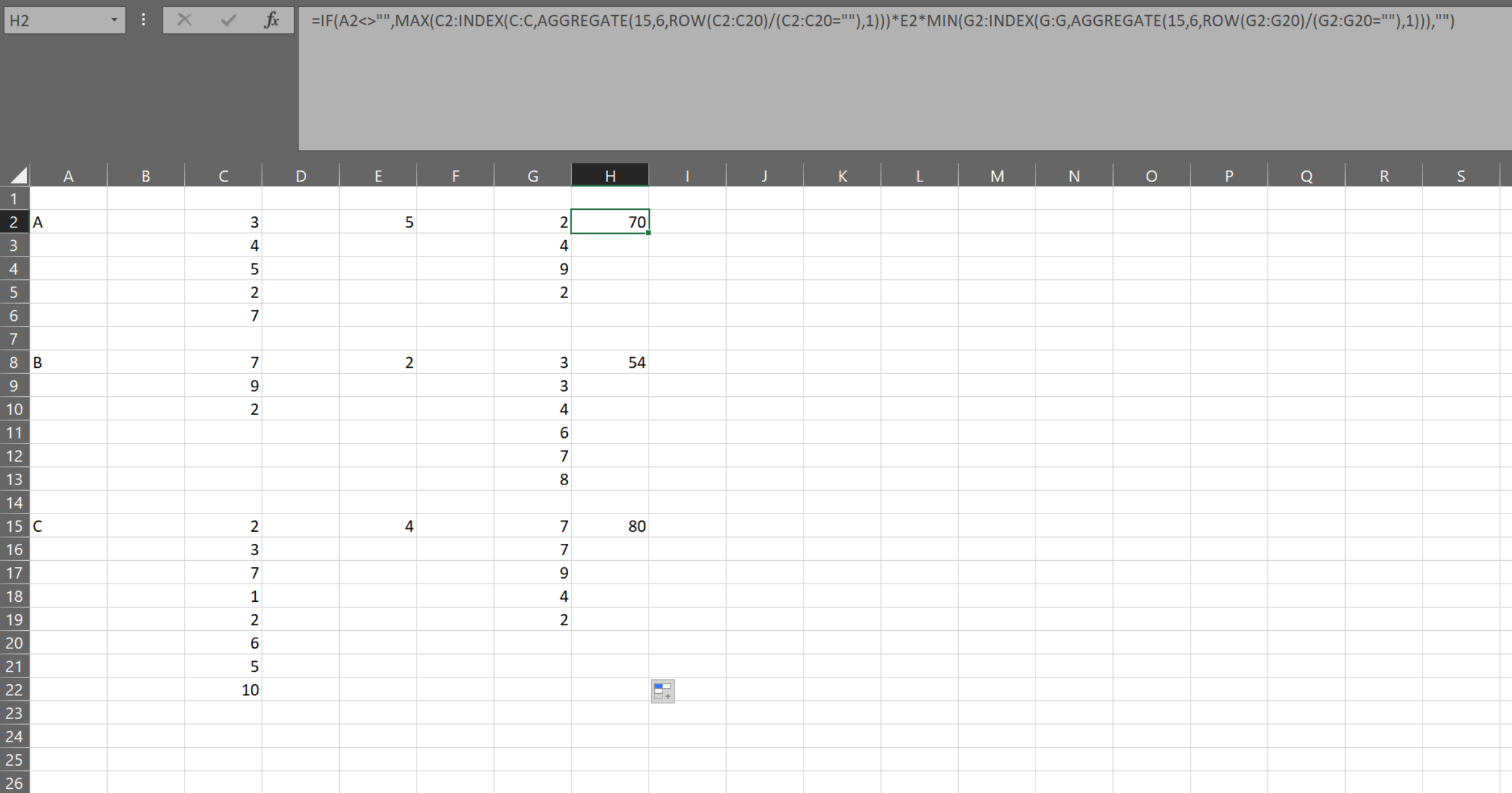 =IF(A2<>"",MAX(C2:INDEX(C:C,AGGREGATE(15,6,ROW(C2:C20)/(C2:C20=""),1)))*E2*MIN(G2:INDEX(G:G,AGGREGATE(15,6,ROW(G2:G20)/(G2:G20=""),1))),"")如果19不是组中的最大数目,则将20s更改为每个组的最大项目数。