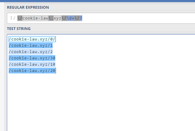 我一直试图从Google Analytics中过滤掉一堆垃圾邮件引用者,并且在大多数情况下都取得了成功,但我对url /cookie-law.xyz/0/ that /cookie-law.xyz/20/有问题。我尝试了一些使用regex元字符的变体,但都没有效果。下面是它作为一个设置的外观:Google分析中过滤器的截图