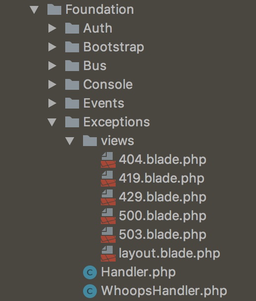 如何在不删除vendor/laravel/framework/src/Illuminate/Foundation/Exceptions/views/500.blade.php的情况下显示错误代码为500的正常异常信息/跟踪。