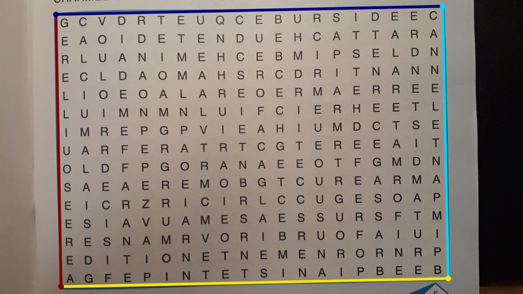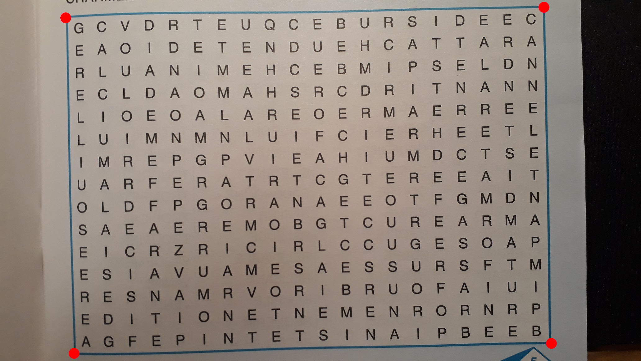 现在使用透视变换将每个点移动到角,使图像直线化。我使用了ImageMagick,但您应该可以看到,我将坐标处(210,51)处的左上角红点转换为(0,0)处新图像的左上角。同样,右上角红点(1754,19)被移到(2064,0).终端中的ImageMagick命令是: