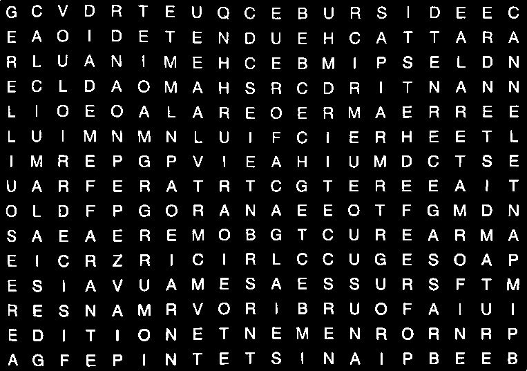 下一个问题是光线不均匀,即左下角的亮度比图像的其他部分暗。为了抵消这一点,我克隆图像并模糊它以去除高频(只是一个盒子-模糊,或盒子平均是好的),所以它现在代表缓慢变化的照明。然后我从中减去图像,所以我有效地去除了背景变化,只留下高频的东西--比如你的字母。然后,我将结果正常化,使白人、白人和黑人成为黑人,阈值为50%。