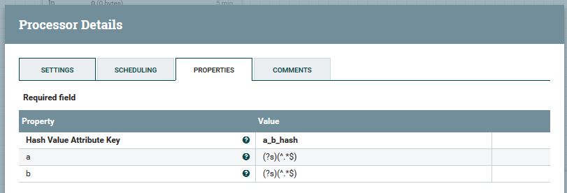 现在,该行为不允许任意字符串连接,因此您必须使用UpdateAttribute处理器使用表达式语言表达式${a}_${b}填充属性a_b以执行连接,然后使用设置为Individual的属性匹配策略填充HashAttribute a_b_hash -> a_b。不需要任何额外的处理器就可以完成c_hash -> c。