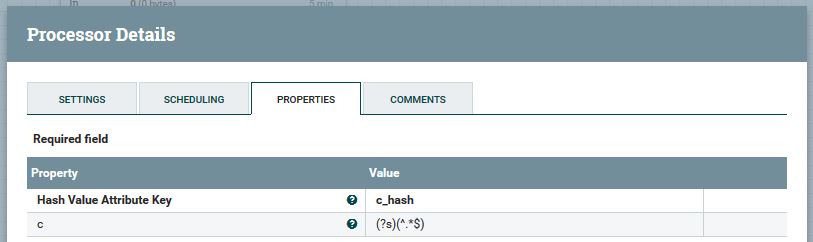 NiFi附带了一个名为HashAttribute的处理器。它的用法类似于,您可以添加动态属性,其中新属性的名称将是FlowFile的名称,而该值是正则表达式,您可以提供(?s)(^.*$)来捕获整个FlowFile属性值。