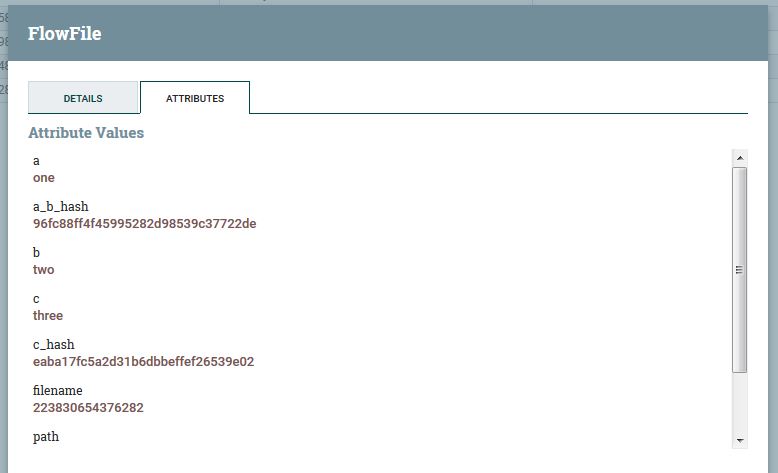 我有一个具有3个属性a,b,c的flowfile,我想创建两个新属性a_b_hash,c_hash。