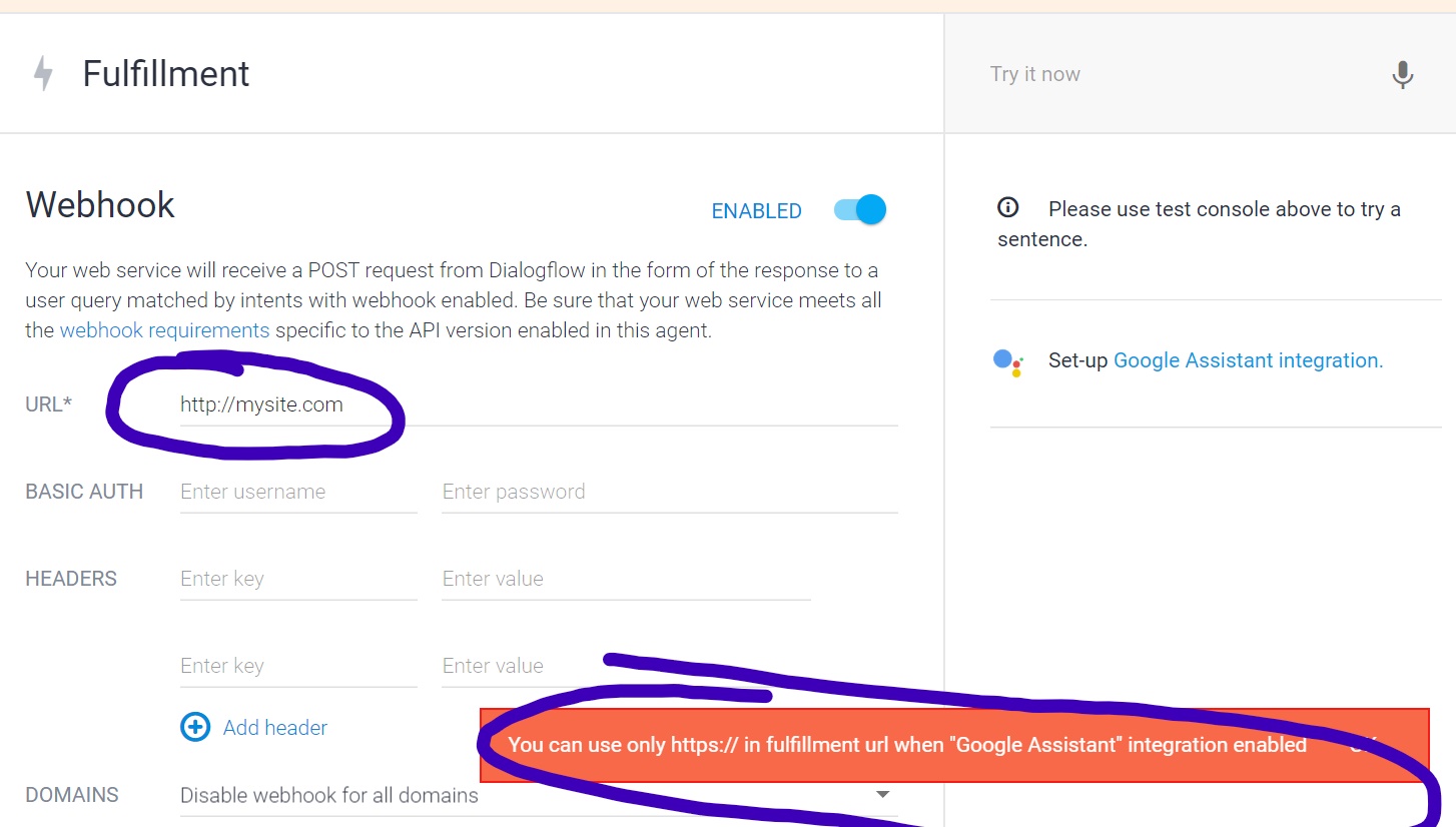 我正试图在我的对话框代理中启用web钩子实现。但是,每当我输入服务的URL时,我都会收到一个错误:You can use only https:// in fulfillment url when "Google Assistant" integration enabled。我没有兴趣使用谷歌助理集成。那么,我如何禁用它,以便将web挂钩发送到我的http:// service?