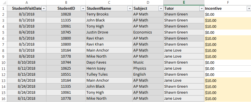 StudentVisitDate StudentId StudentName Subject Tutor Incentive