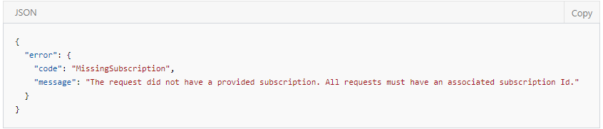 {“错误”:{“代码”:"MissingSubscription",“消息”:“请求没有提供的订阅。所有请求都必须具有关联的订阅Id”}}