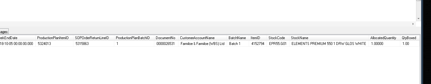SELECT pp.ProductionPlanID, pp.WeekStartDate, pp.WeekEndDate, ppi.ProductionPlanItemID, ppi.SOPOrderReturnLineID, bat.ProductionPlanBatchID, sop.DocumentNo,