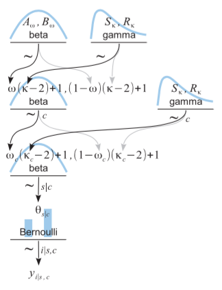 “BUGS模型使用二项似然分布来进行完全正确,而不是在个别试验中使用Bernoulli分布。这种使用二项分布只是为了缩短程序。如果数据被指定为试用结果而不是完全正确,则该模型可以包含一个逐次试验循环,并使用Bernoulli似然函数。”