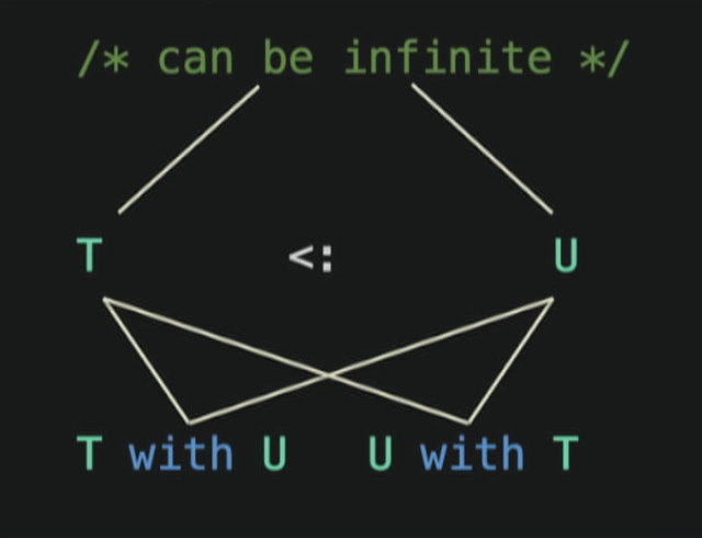 Martin 提到过说,他们在dotty中引入了复合类型和交叉类型。在他的幻灯片上有两张图片,代表新旧系统上下界的差异。