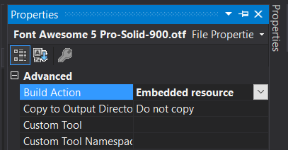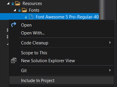 ExportFont属性(通常在App.xaml.cs或AssemblyInfo.cs中)。// "Font Awesome 5 Pro-Regular-400.otf" is the font file name witout the subfolders path