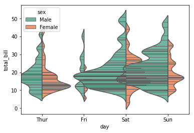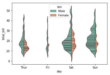 ax = sns.violinplot(x="day", y="total_bill", hue="sex",