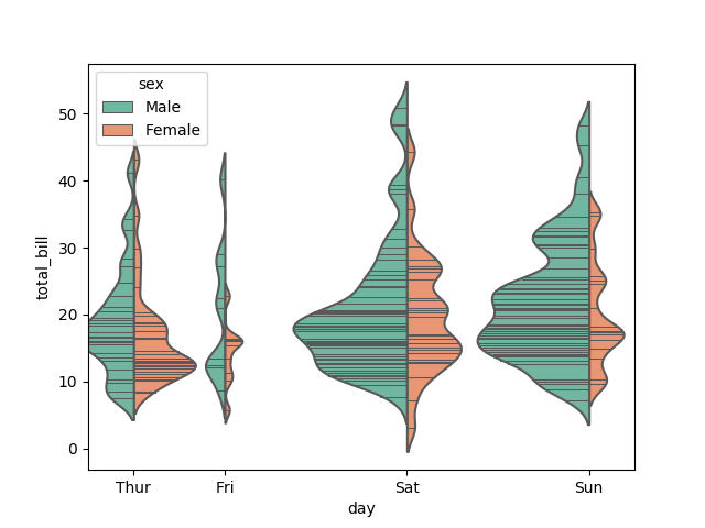 但是,当数据是异构的时,特定组的width太小,无法显示任何意义信息(图1中的Fri组)。在海运小提琴图中有width选项,用于扩大绘图的大小。