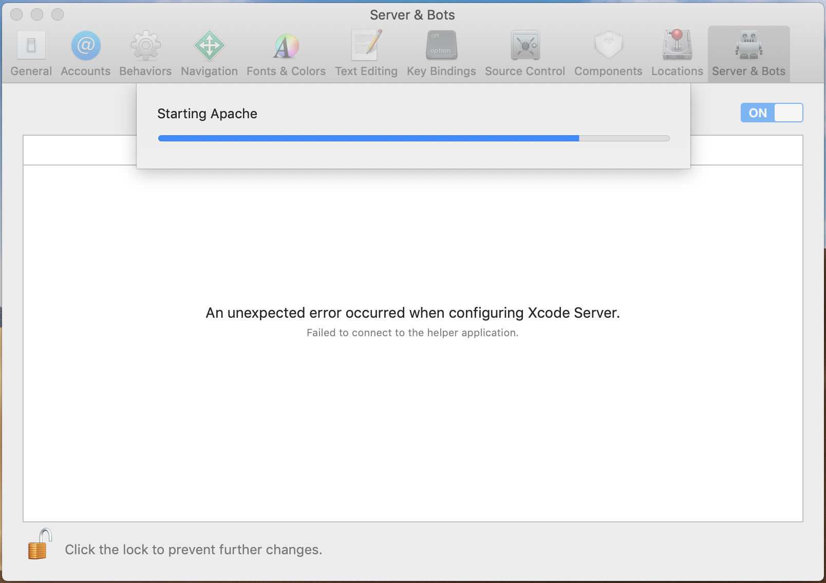 我将Mini更新为Mojave,也更新为Xcode 10,我在Xcode 9.4.1中配置了Xcode服务器,它正在运行,甚至存在一些问题,比如无法将IPA直接安装到设备上。今天我更新了我的Xcode并尝试更新Xcode服务器,它在启动Apache时抛出了一个错误。这是屏幕截图。