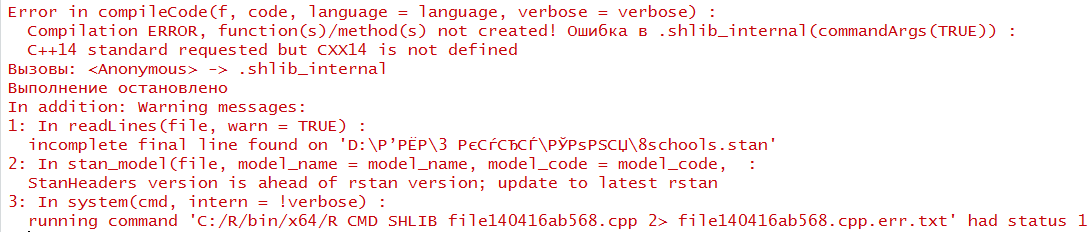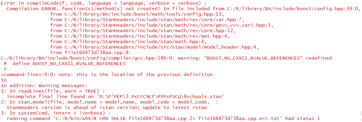 我正在尝试从这个官方的教程中运行经典的r-stan示例。但我做不到,因为我得到了以下错误消息: