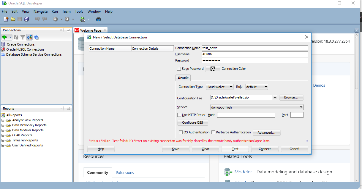 我试图使用JDBC瘦连接连接到,并使用以下方式连接钱包: 1. SQLDeveloper 2. Sqlcl