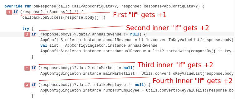 因此,每当上述规则匹配时,只要将+计数添加到CC中,记住计数就会根据代码中断的级别增加,例如" if“条件获得+1,如果这是第一个代码中断,但是如果您使用了多一个嵌套的如果,那么它将是一个+2的内部" if”,如下图所示。