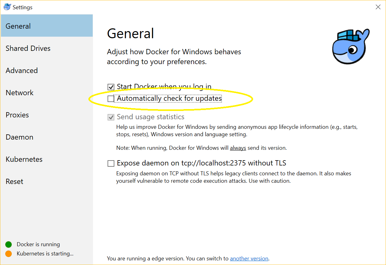 Automatically check for updates框,为我修复它。imagePullPolicy: IfNotPresent。我这样做是为了我的kubernetes-dashboard部署。