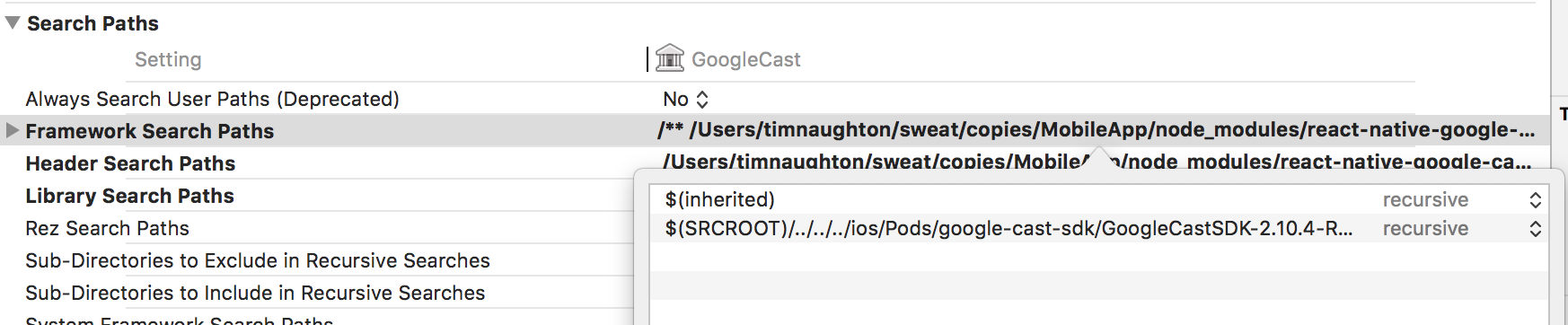 此库的链接似乎没有正确设置。为了解决这个问题,我在库文件夹中选择了GoogleCast.cxodeproj,并将Framework Search Paths更新为$(PROJECT_DIR)/../../../ios/Pods/google-cast-sdk/GoogleCastSDK-2.10.4-Release