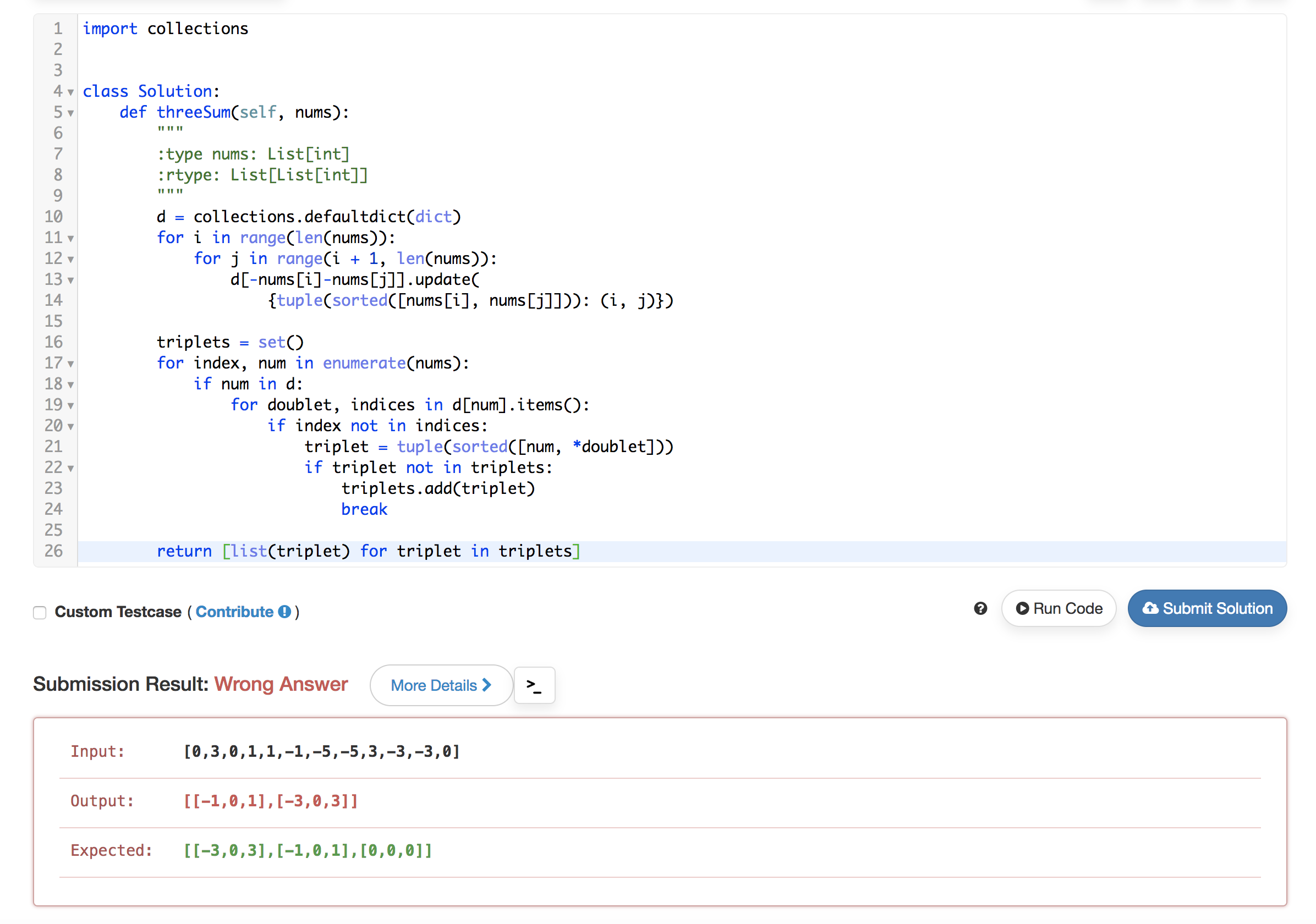 Out[2]: [[-1, 0, 1], [0, 0, 0], [-3, 0, 3]]看起来,LeetCode的“输出”似乎与我的输出不一样。你知道我怎么才能让这个解决方案被接受吗?