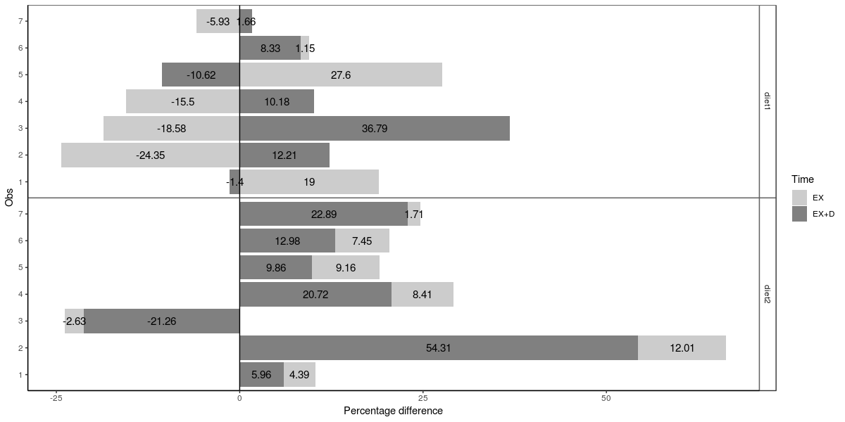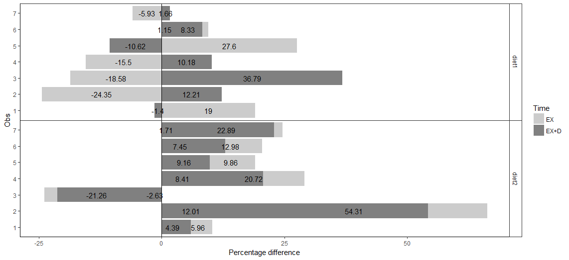 vv+ scale_fill_grey(start=0.8, end=0.5)+labs(x="Obs", y="Percentage difference", fill="Time") + theme_bw() + theme( panel.grid.major = element_blank(), panel.grid.minor = element_blank(), axis.line = element_line(colour = "black"),panel.spacing = unit(0, "lines"),