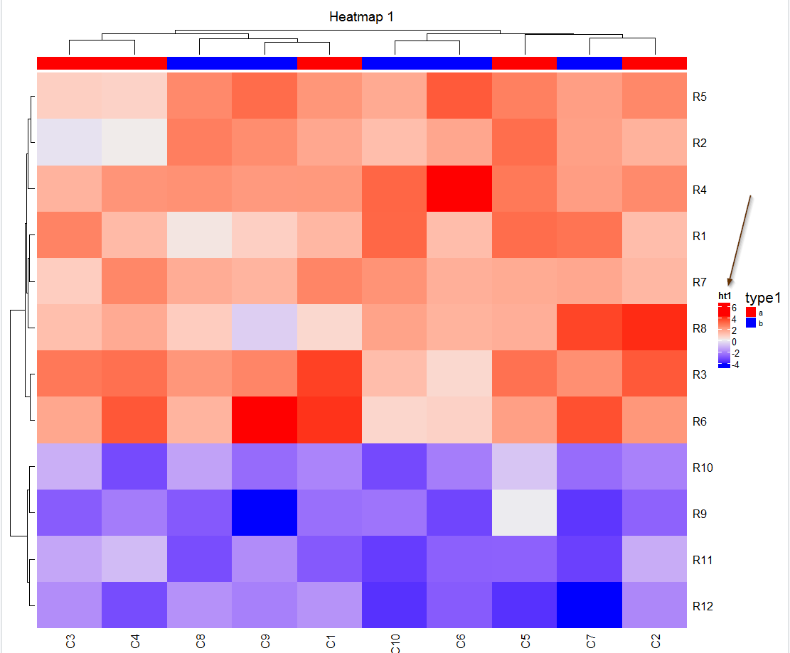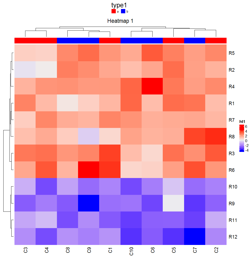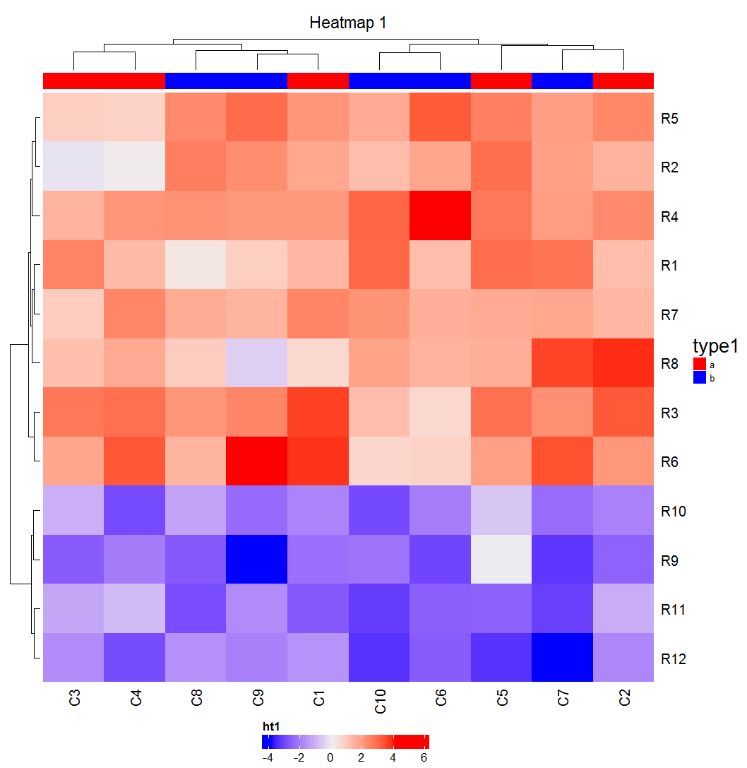 ha_column = HeatmapAnnotation(df = data.frame(type1 = c(rep("a", 5), rep("b", 5))),
