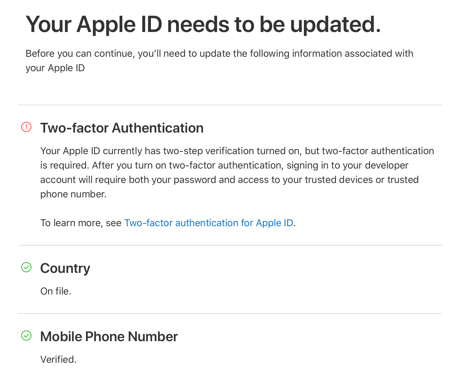 我正在尝试注册付费的开发商计划。我用我的AppleID启用了2FA,并验证了一个可信的电话号码和一个可信的设备。我一直看到这个:双因素认证