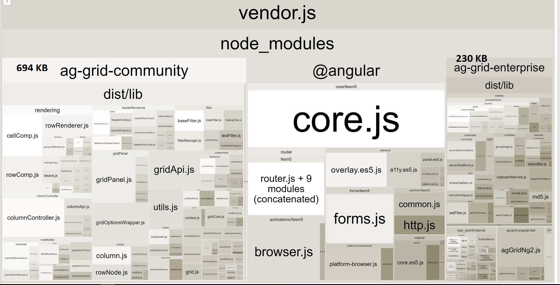 编译后,主包的总大小超过1.5MB。在这个ag-grid-community是694 KB,ag-grid-enterprise是230 KB: