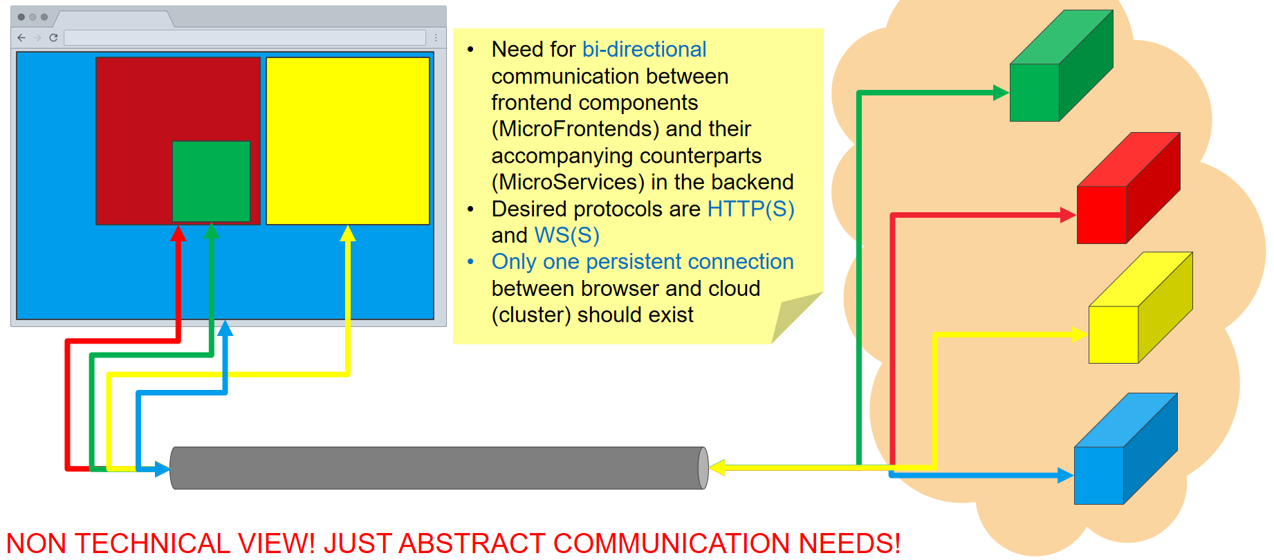 我将采用您在前端后端使用的相同方法。创建一个HTTP或WS网关,前端组件将对请求进行轮询。它将连接到后端BFF,在那里您解决了所有的问题。无论何时您想要交换组件、传输或体系结构,其中一个并不依赖于另一个组件。