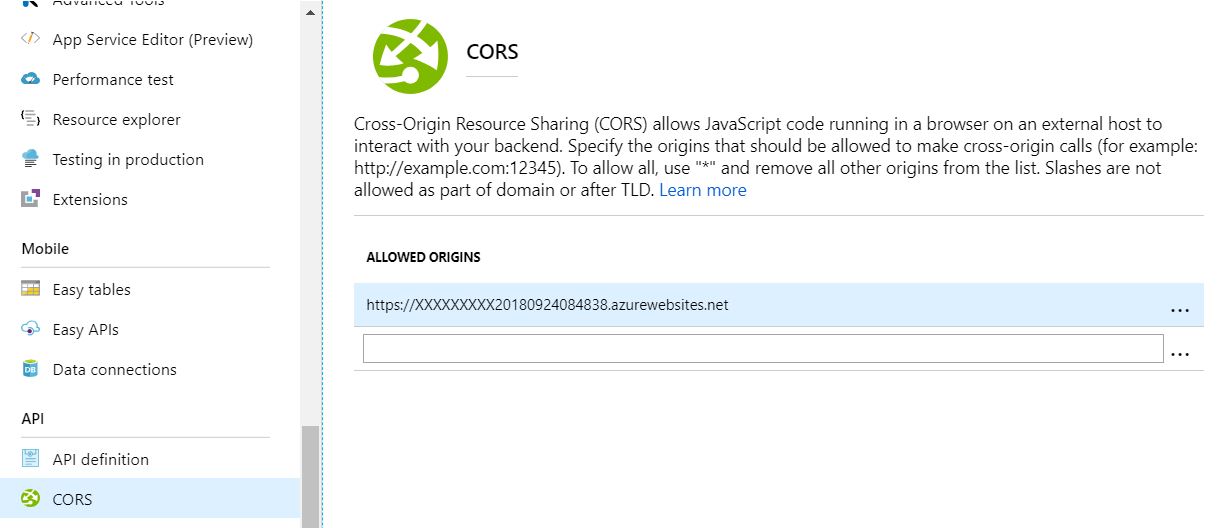 此外,我还在CORS下的Azure中添加了以下代码到我的web应用程序配置中。