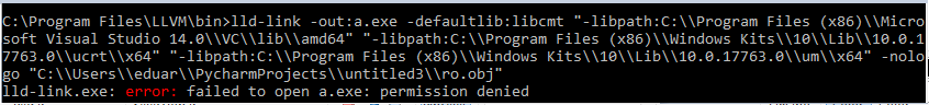 您正在尝试将a.exe写入C:\Program Files\LLVM\bin。在链接之前,可以将cd保存到代码目录,也可以指定一个绝对路径,以便将a.exe保存到命令的-out:a.exe部分。
