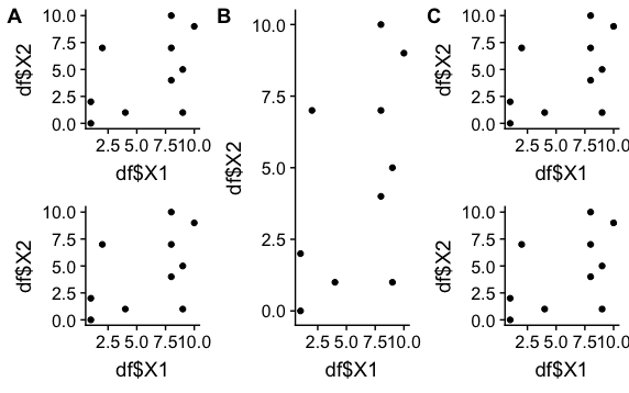 plot_grid(plot.a, plot.b, plot.c, labels = c("A", "B", "C"), align = "h", axis = "b", nrow = 1, ncol = 3)我预计,通过调整面板水平(align = "h", axis = "b"),底轴的绘图将正确地对齐,但我做了一些错误。