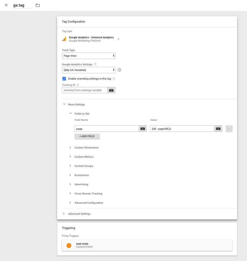 然后在GTM中创建标签。确保它是"pageview“类型,然后选中”启用此标记中的覆盖设置“复选框,在”多个设置>字段“下为字段名设置”type in“页面,并为我们创建的变量"value”引用。如果要使用to.name变量设置页面标题,只需使用" title“字段即可。确保添加nuxt路由触发器以及在“触发”下。