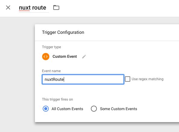 }事件的默认名称是“nuxtRoute”。因此,在GTM中,您将定义一个自定义事件触发器来触发“nuxtRoute”事件。