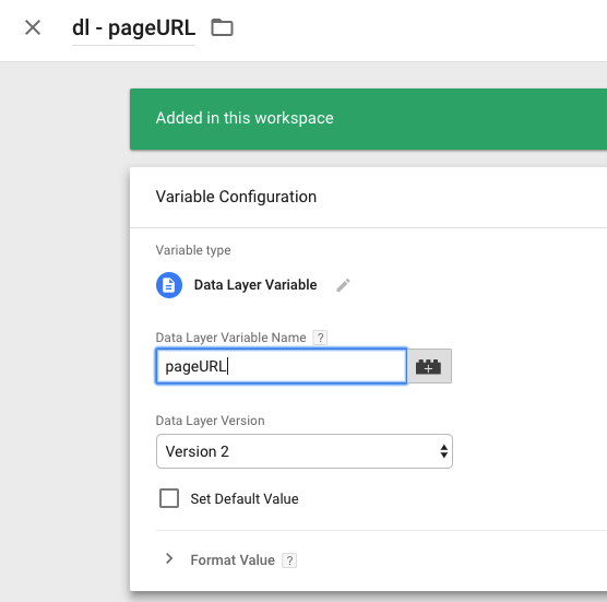 然后要在GTM中创建两个DataLayer变量,它们将捕获pageUrl(请注意骆驼的情况)和可能的routeName,我认为routeName是可选的,取决于您是否正在更改/更新文档。