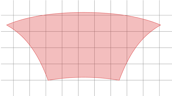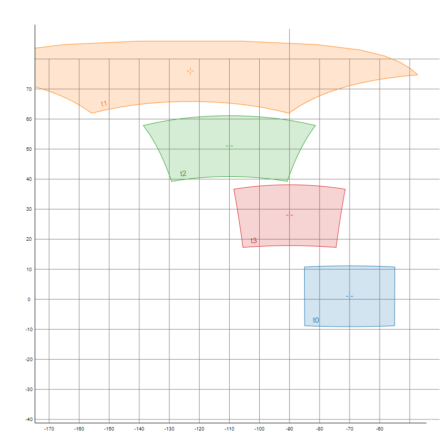 .scale(1500)在gnomonic图上,我在其边界上放置了点,然后使用d3.projection.invert方法重新投影这些点,并使用d3.geoEquirectangular投影图上产生的角度绘制区域(就像这里),结果如下: