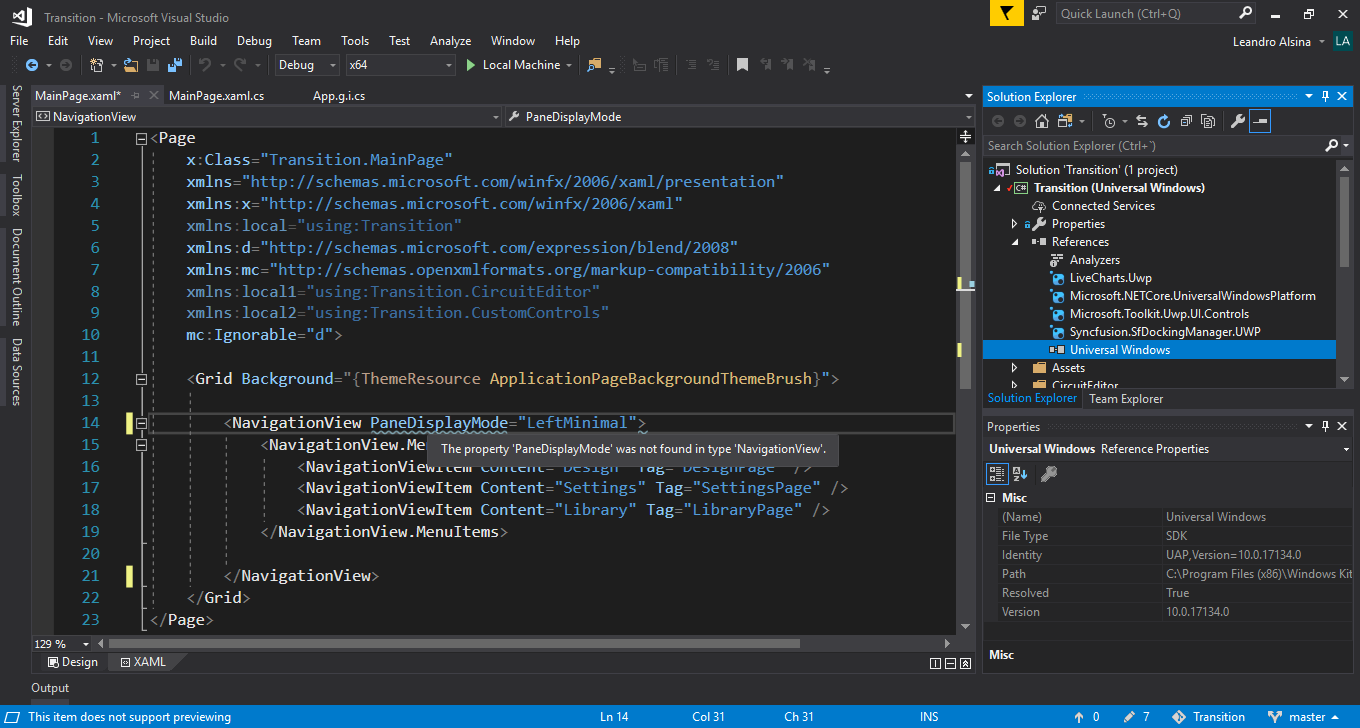 </NavigationView>IDE VS2017 (社区)说:“在‘导航视图’类型中找不到'PaneDisplayMode‘属性。”!