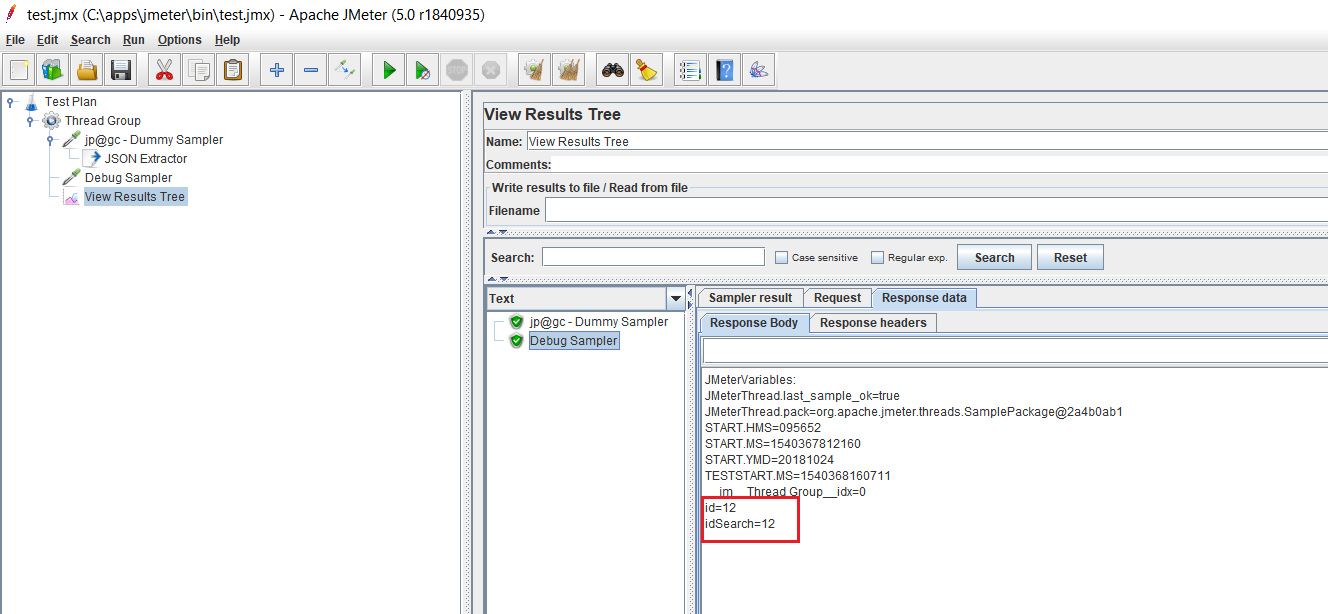 可以使用${idSearch}和查看结果树侦听器组合检查调试采样器变量值: