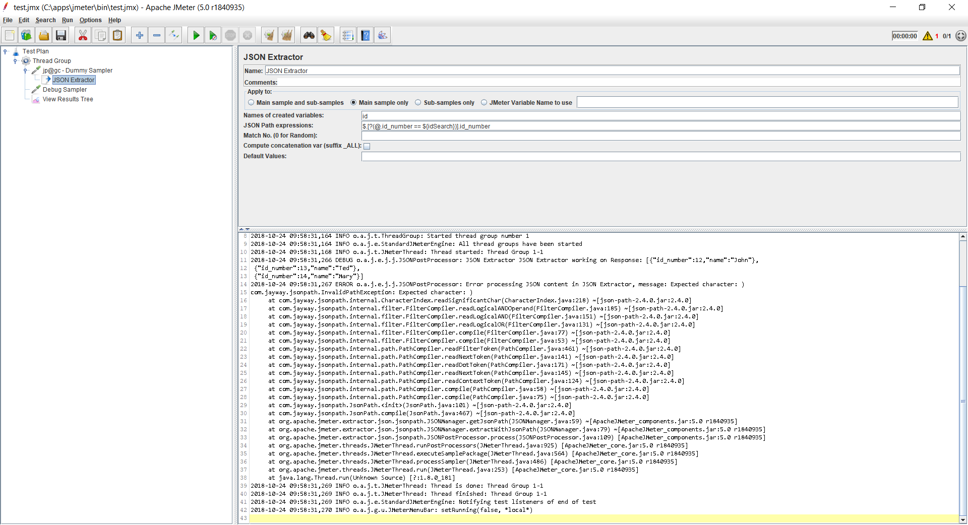 <Logger name="org.apache.jmeter.extractor.json.jsonpath.JSONPostProcessor" level="debug" />一旦完成,您应该看到jmeter.log文件或日志查看器窗口中到底发生了什么