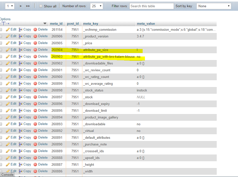 2 | attribute_pa_with-bro-kalam-blouse | yes通过在ID上聚合,我们可以为我们想要的任何键找出值。例如,要检查attribute_pa_with-bro-kalam-blouse键的值,我们可以使用: