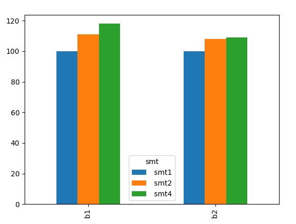 df.plot(kind="bar")这给了我一个条形图,每个酒吧的间隔都是均匀的。但是,我怎样才能在没有任何间隔的情况下将b1组合在一起,然后在b2分组之前有一个空间呢?