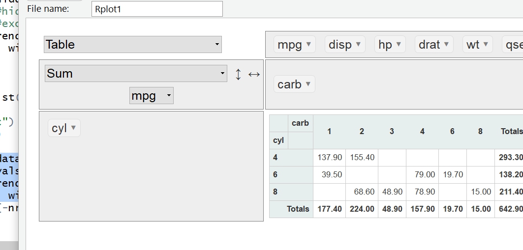 rpivotTable(data = mtcars, subtotals = FALSE, rows = c( "cyl"),cols=c("carb"), vals = "mpg", aggregatorName = "Sum", rendererName = "Table", width="50%", height="550px")